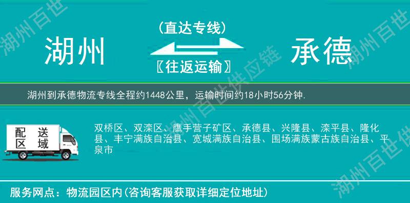 湖州到承德物流专线全程约1448公里,专线运输耗时约18小时56分钟, 湖州到承德物流专线是湖州百世供应链重点打造物流线路之一,找湖州到承德物流公司就选湖州百世供应链,我们将竭诚为您提供专业湖州到承德物流货运服务。