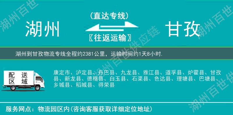 湖州德清县到甘孜物流专线可以提供门到门服务,在湖州、吴兴区、安吉县、南浔区、德清县、长兴县、等地都设有门店,提供上门提货、送货上门服务。