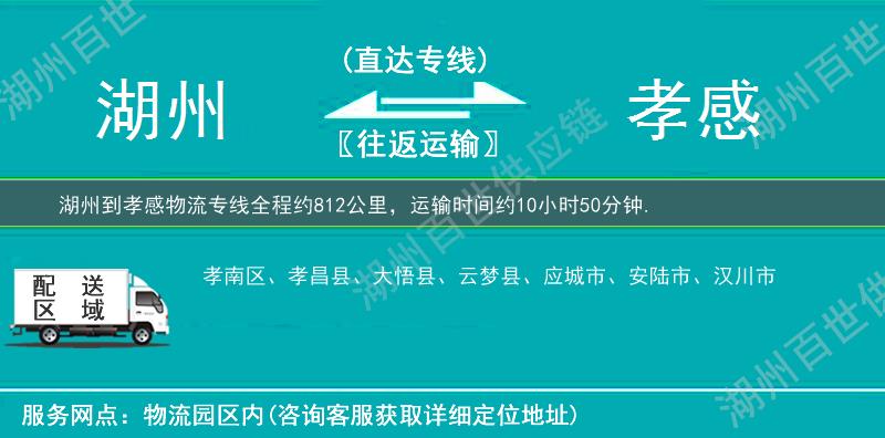 湖州到孝感物流专线是湖州百世供应链从湖州发往至孝感的物流货运专线,天天发车二到三天即可抵达,孝感可送货的范围包括: 应城市、汉川市、云梦县、安陆市、孝昌县、大悟县、孝南区、。
