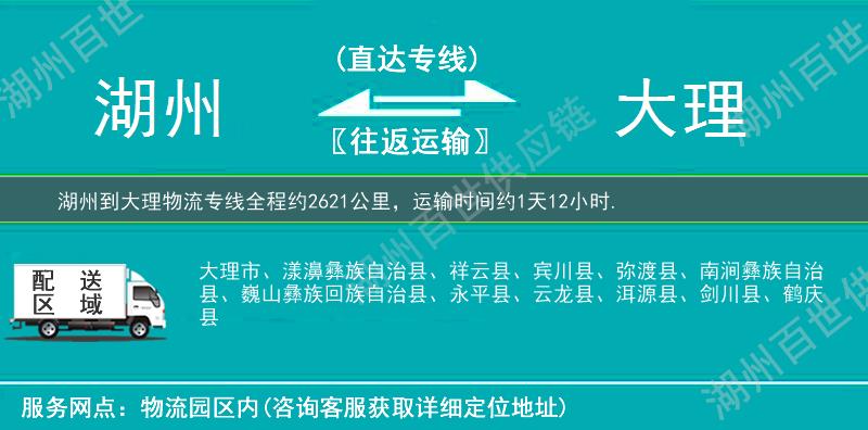 湖州南浔区到大理物流专线专业是湖州百世供应链重点运营货运专线,提供湖州南浔区至大理搬家行李托运,冷链运输,大件运输,航空托运,小轿车托运,电商物流,整车零担货运,超市配送业务。湖州南浔区到大理物流专线全程约2621公里,专线运输耗时约1天12小时。
