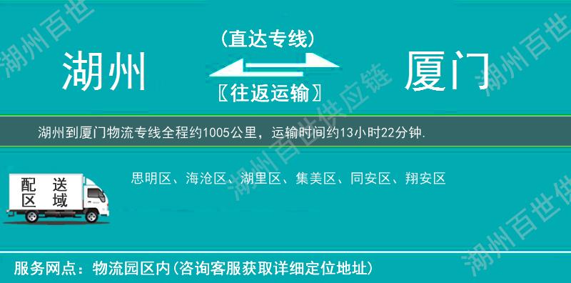 湖州南浔区到厦门物流专线专业是湖州百世供应链重点运营货运专线,提供湖州南浔区至厦门搬家行李托运,冷链运输,大件运输,航空托运,小轿车托运,电商物流,整车零担货运,超市配送业务。湖州南浔区到厦门物流专线全程约1005公里,专线运输耗时约13小时22分钟。