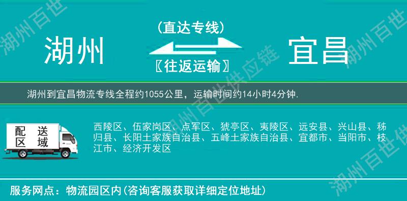 湖州南浔区到宜昌物流专线专业是湖州百世供应链重点运营货运专线,提供湖州南浔区至宜昌搬家行李托运,冷链运输,大件运输,航空托运,小轿车托运,电商物流,整车零担货运,超市配送业务。湖州南浔区到宜昌物流专线全程约1055公里,专线运输耗时约14小时4分钟。