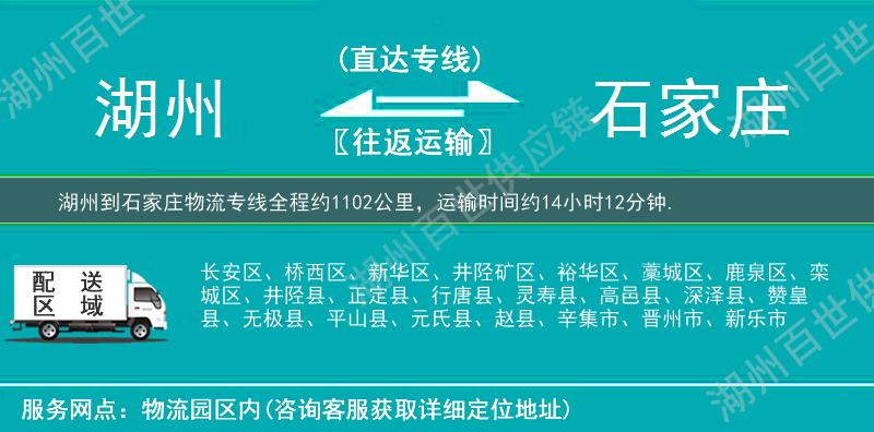 湖州到石家庄物流专线专业是湖州百世供应链重点运营货运专线,提供湖州至石家庄搬家行李托运,冷链运输,大件运输,航空托运,小轿车托运,电商物流,整车零担货运,超市配送业务。湖州到石家庄物流专线全程约1102公里,专线运输耗时约14小时12分钟。