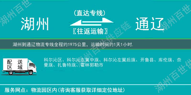 湖州到通辽物流专线全程约1975公里,专线运输耗时约1天1小时。湖州到通辽物流专线是湖州百世供应链推出的从湖州到通辽的物流专线直达运输,提供湖州到通辽货运公司电话查询价格和费用,快速安全将货物送达,做用户放心的货运物流服务商。